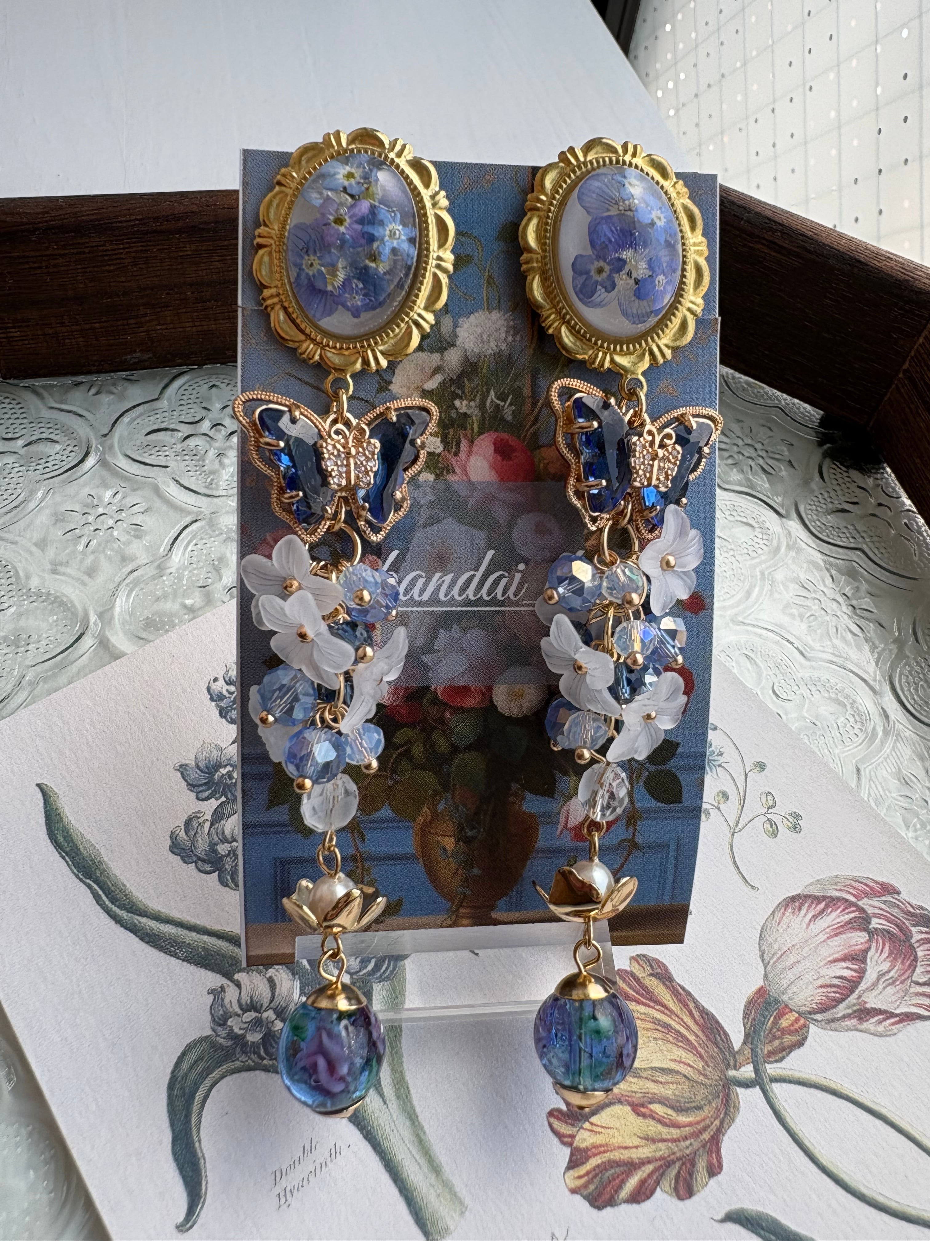 この作品は、まるで花畑のような美しいチャームの上を青いガラスの蝶が舞う、キラキラしたクラシカルな耳飾りです。