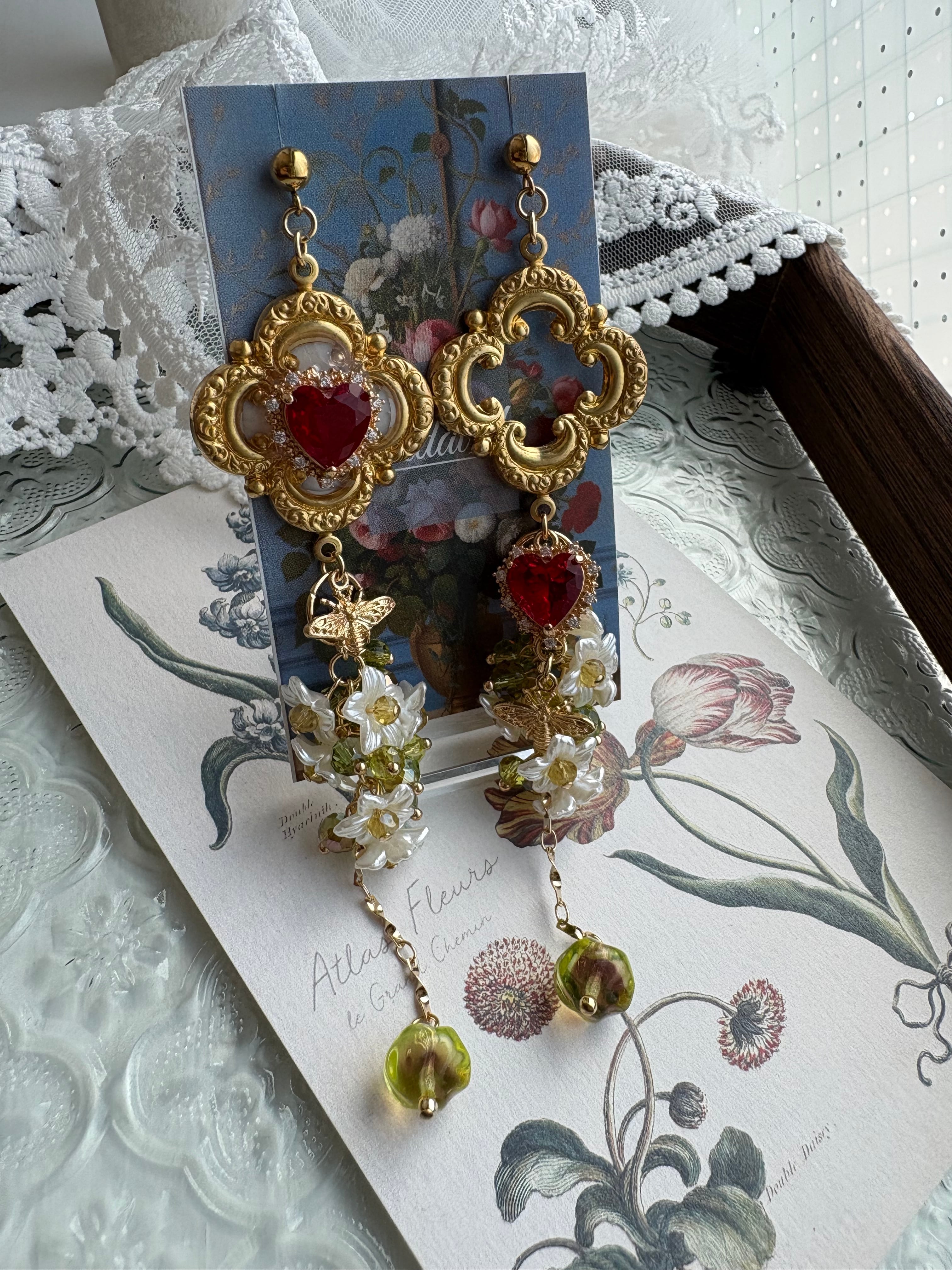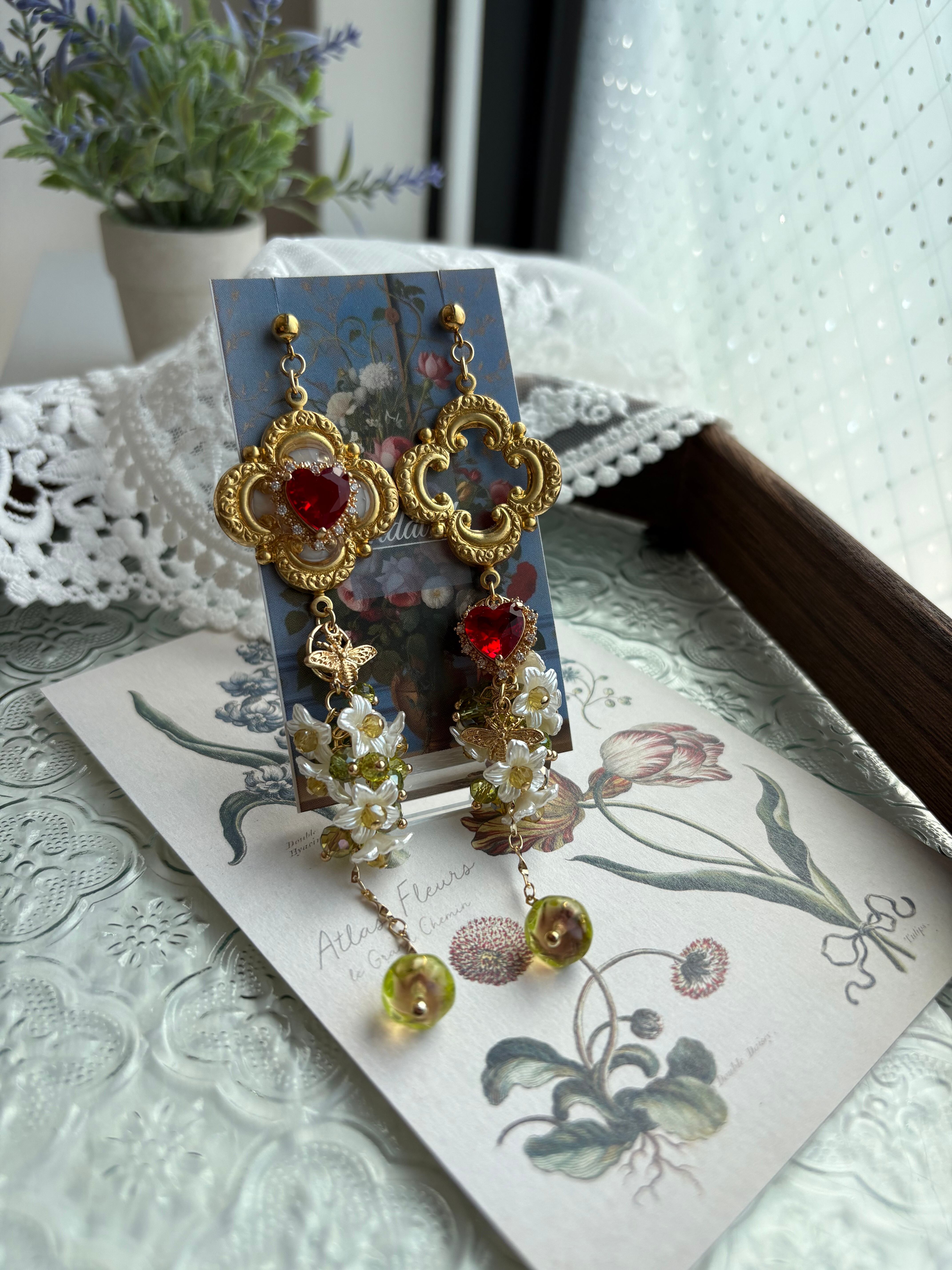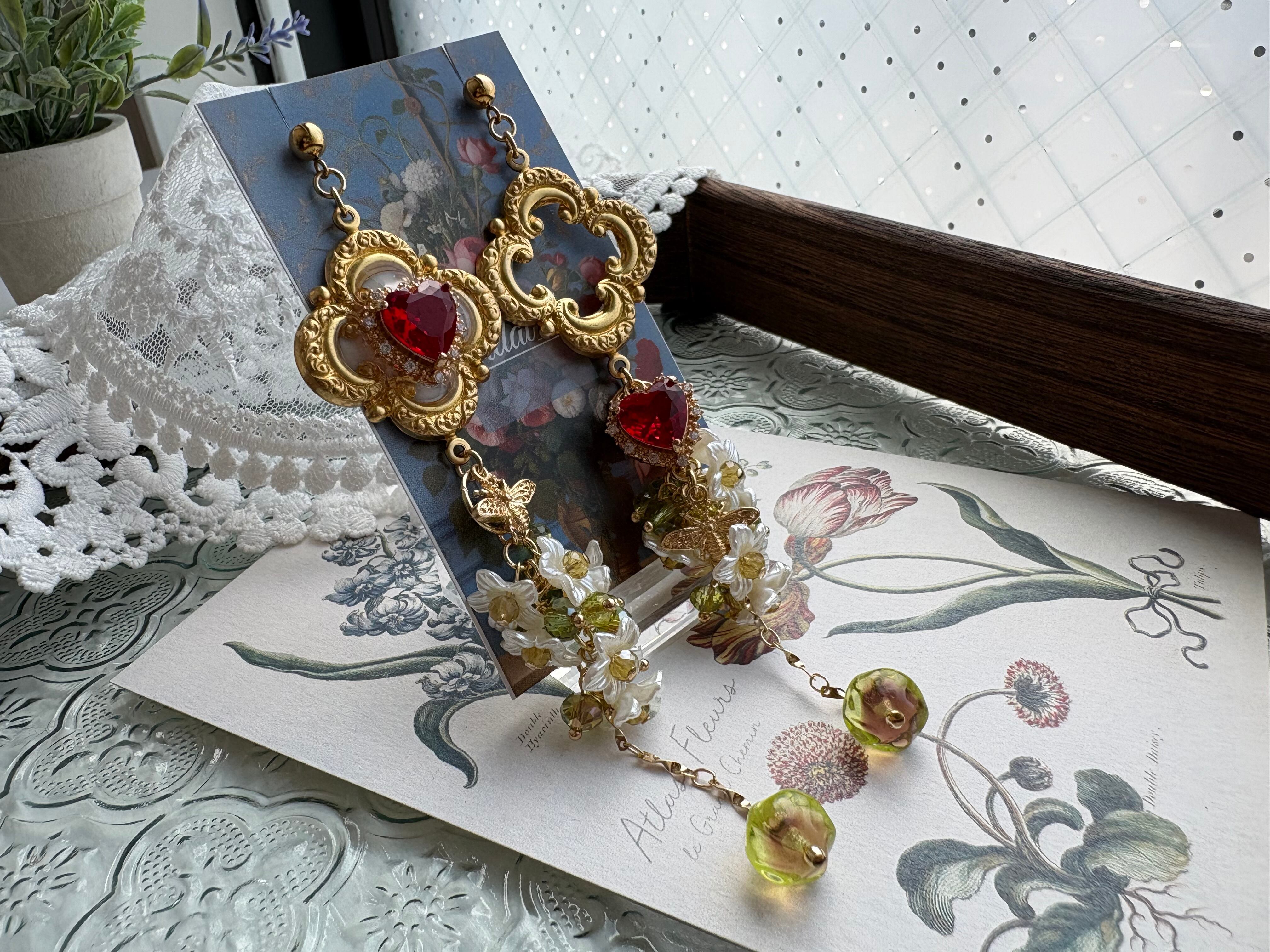 この作品は、ユキヤナギの美しさをモチーフにしたチャームと、赤いハートが対比する大ぶりの耳飾りです。