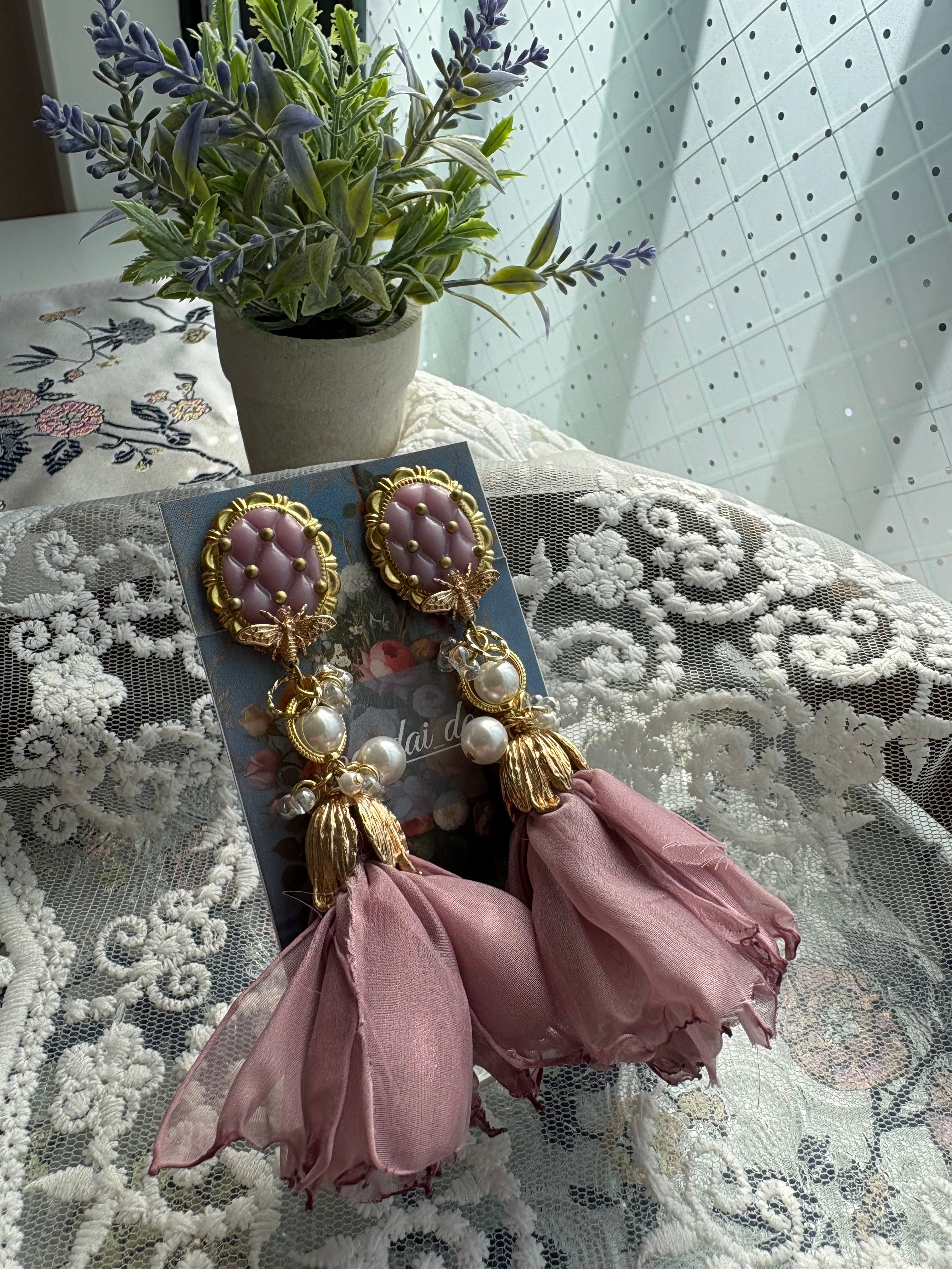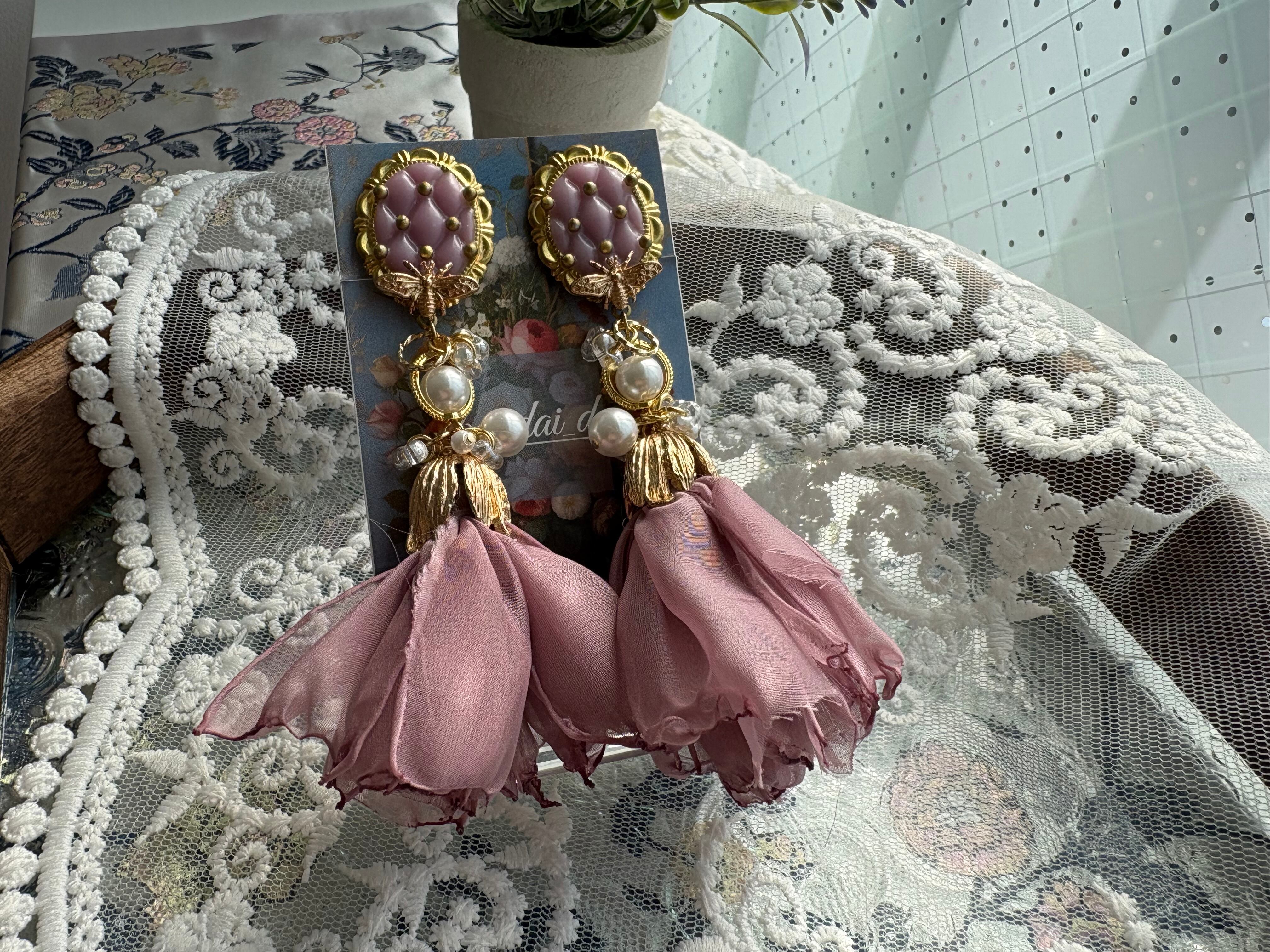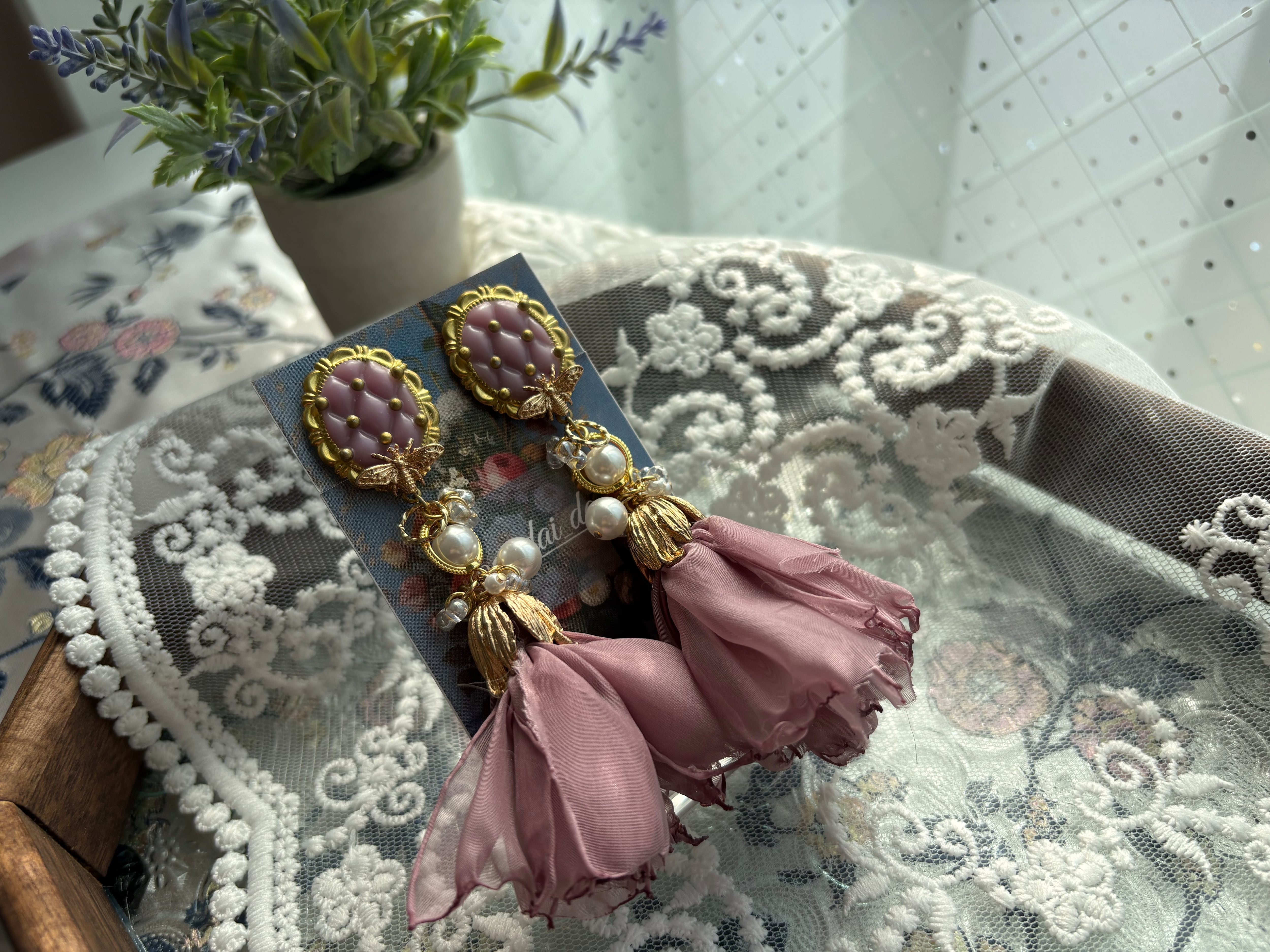 綺麗めライン くすみピンク 耳飾り シフォンチャーム クラシカル ハンドメイド アクセサリー 可愛い 上品 華やか 特別な日 普段使い ピアス イヤリング